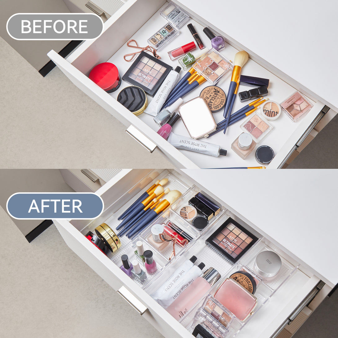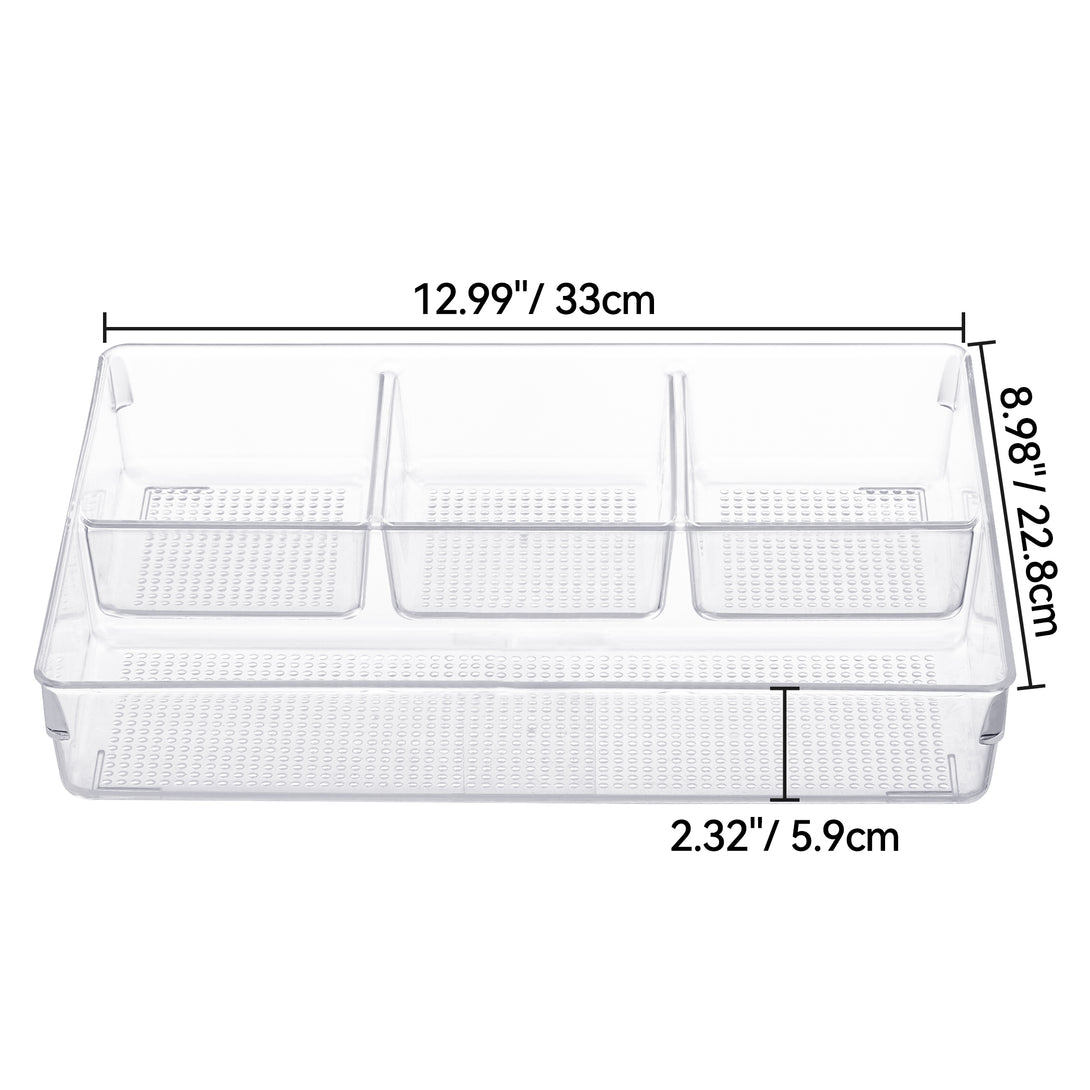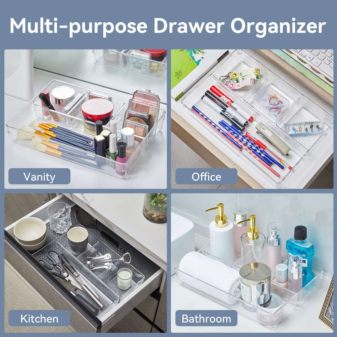Transform your cluttered drawers into organized spaces with this versatile 8-section clear acrylic drawer organizer. Measuring 13.7 x 8.7 x 2 inches, this large divider tray is perfect for keeping your items sorted and easily accessible. The transparent design allows you to quickly locate what you need, while the sturdy construction ensures long-lasting use. Whether you're organizing office supplies, bathroom essentials, makeup collections, or miscellaneous items, this drawer organizer helps maintain order and efficiency. The eight compartments provide ample space for sorting different categories of items, making it an ideal storage solution for your desk, vanity, or bathroom drawer. Keep your space tidy and your items properly segregated with this practical and stylish drawer organizer.